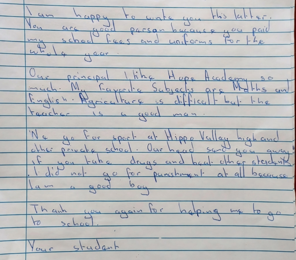 “I am happy to write you this letter. You are good person because you paid my school fees and uniforms for the whole year. Our principal I like, Hope Academy so much. My favorite subjects are maths and English. Agriculture is difficult but the teacher is a good man. We go for sport at Hippo Valley high school. Our head sends you away if you take drugs and beat other students. I did not go for punishment at all because I am a good boy. Thank you again for helping me to go to school. Your student, Tavonga.”